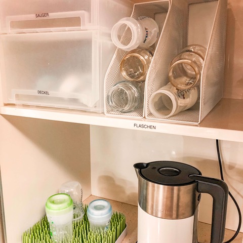 Wenn dein Baby Fläschchen bekommt, weißt du bestimmt, wie viel Zubehör damit einher kommt. Ein Tipp von mir, damit die Flaschen im Kasten nicht ständig umfallen: Stapel sie in einem Magazinhalter. Die ganzen Kleinteile wie Deckel und Nuckel kannst du zB in einem Organizer mit Schubladen aufbewahren.