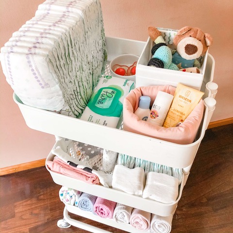 Wenn du keinen Stauraum am Wickeltisch hast oder gar keinen Wickeltisch besitzt, empfehle ich, alle Wickelutensilien in einem Rollwagen oder in einer tragbaren Box zu verstauen. Diese Rollwägen sind super vielseitig, bieten viel Platz und können von einem in den anderen Raum gerollt werden. Ich empfehle darin Windeln, Feuchttücher, Cremen, Nagelschere, Spucktücher, etwas Spielzeug zum Ablenken, Lätzchen und auch Ersatzgewand aufzubewahren.