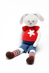 Eigentlich sollte es ein Beitrag über unterschiedliche Ostergeschenke werden. Da es aber so viele süße Hasen gibt, wurden es eben hauptsächlich Hasen. Absolut herzig ist diese Hasen-Rassel gestrickt aus Baumwollgarn, oder der gehäkelte Hasenjunge (beides von Frecher Zwerg und online erhältlich). Sehr flauschig und absolute Klassiker sind die Kuscheltiere von Steiff – passend für Ostern ist dieser Hoppel Hase (gibt’s in blau und rosa). Und eine kuschelige Alternative zur Schnullerkette ist der Schnuller-Hase von Jako-o (ebenfalls blau oder rosa)
