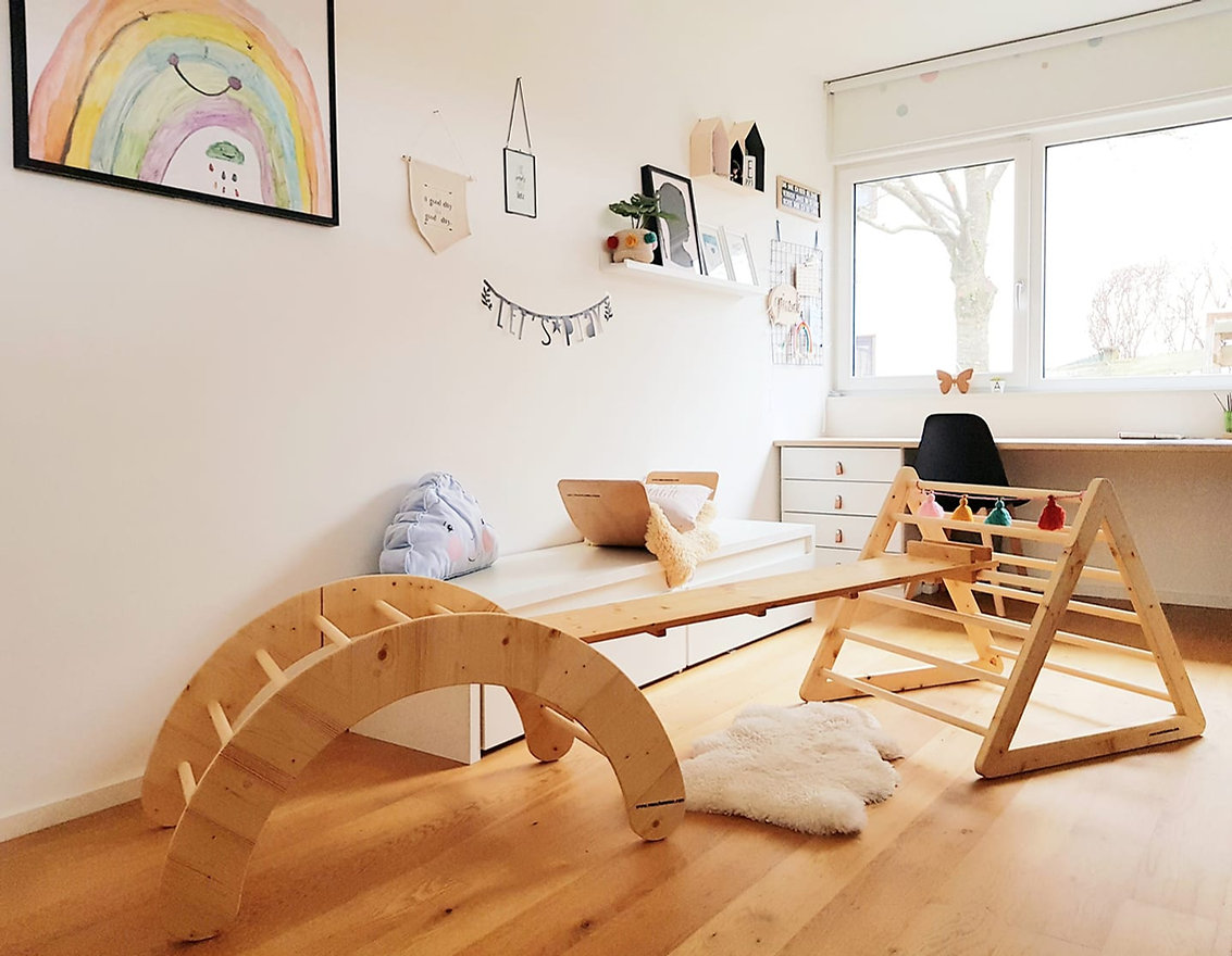 Sobald dein Kind krabbeln kann, kannst du ihm das Sprossendreieck (auch in Kombination mit einem Rutschbrett) anbieten.
