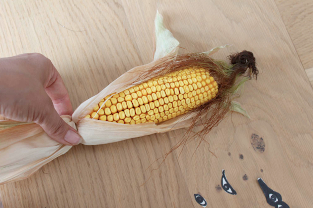 Dann geht es auch schon los. Maiskolben zurecht legen. Für kleine Trolle könnt ihr den Maiskolben einfach halbieren.