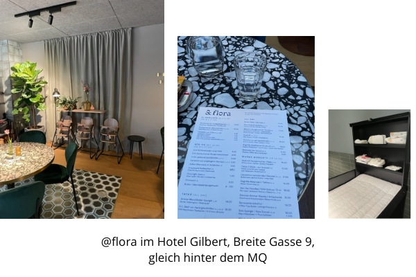 Wir starten im Museumsquartier und schauen bei der Kinderinfo vorbei. Dort bekommst du übrigens auch unser Magazin! Dann geht es weiter Richtung Ausgang zur Breite Gasse. Dort in dem neu eröffneten Hotel Gilbert (Breite Gasse 9) ist das &flora.