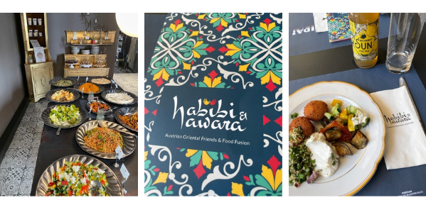 Das Habibi und Hawara hat mittlerweile fünf Standorte in Wien. Hier am Siebensternplatz gibt es mittags ein Buffett - ausschließlich das Buffett, a la carte kann man nicht essen, also nur was für großen Hunger! Sitzen kann man entweder an einem der Tisch draußen oder wenn man es mit Baby ruhiger mag, hinten in dem großen Gastraum.