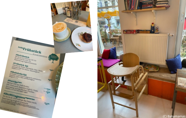 Gleich beim Eingang sind uns an dem "Schwarzen Bett" einige Zettel von Kindergruppen und Co aufgefallen, es gibt einen Hochstuhl und einige Spielsachen. Der Papa, der nachmittags mit seinem kleinen Sohn kam, hat mit ihm Mikado gespielt. Es gibt auch warme Speisen: Frühstück und täglich wechselnde Mittagsgerichte, die immer auf Instagram gepostet werden. Reservierung ist empfohlen. Es gibt nur wenige kleine Tische innen und draußen einen einladenden Gastgarten (der nächste Sommer kommt bestimmt!).