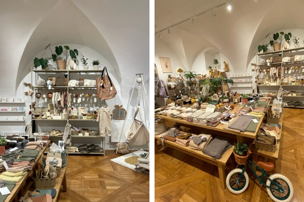 So viele nette Sachen gibt es in dem Laden, da kann man schwer ohne was rausgehen. Das Geschäft ist entzückend aber auch sehr eng. Lieber mit Trage kommen oder Baby aus dem Wagen nehmen. Der Kinderwagen kann im Hof gut geparkt werden.