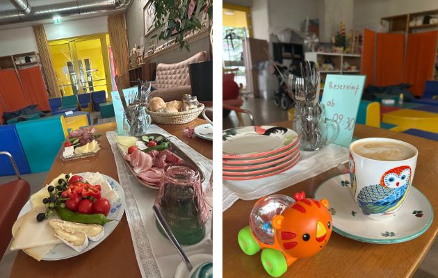 Wir haben einen Tisch reserviert und wurden vorab darauf aufmerksam gemacht, dass wir ein Frühstück um €12.- inkl. Heißgetränk vorbestellen können. Wir konnten zwischen vegan, vegetarisch und omnivor auswählen. Wir können das omnivor Frühstück empfehlen. Sehr lecker und eine gute Auswahl an Wurst, Käse und Rohkost - vorteilhaft wenn dein Baby schon mit der Beikost angefangen hat - war dabei.
