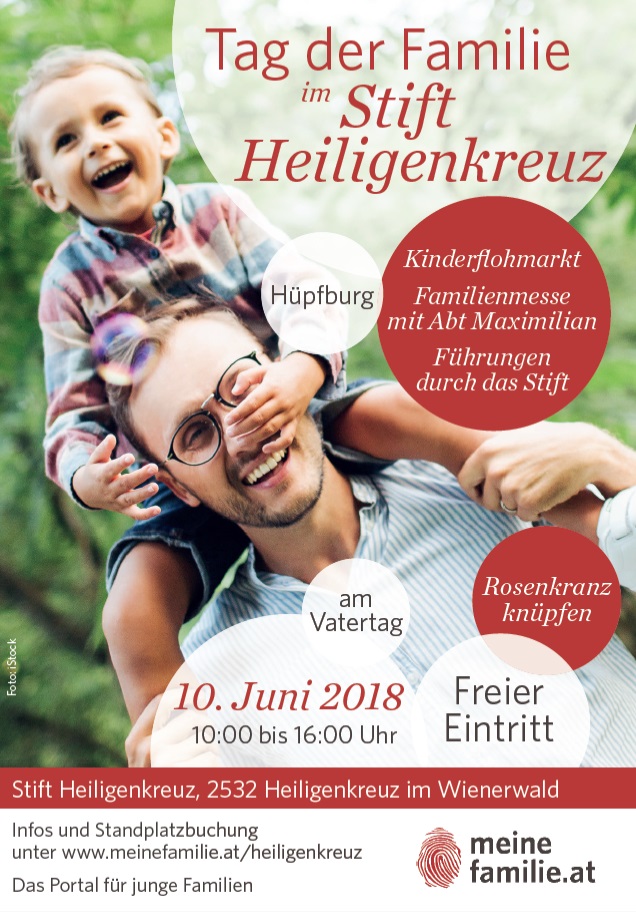 Die Mönche des Stiftes Heiligenkreuz und meinefamilie.at laden zu einem Tag für die ganze Familie mit buntem Programm! Von einem Kinderflohmarkt bis hin zu Kinderführungen durch das Stift und einer Kinderandacht mit dem Abt wird allerhand geboten. Lasst euch die Chance auf diesen besonderen Familienausflug nicht entgehen! Tipp für Aussteller: Melden Sie sich für einen Standplatz zum Kinderflohmarkt an